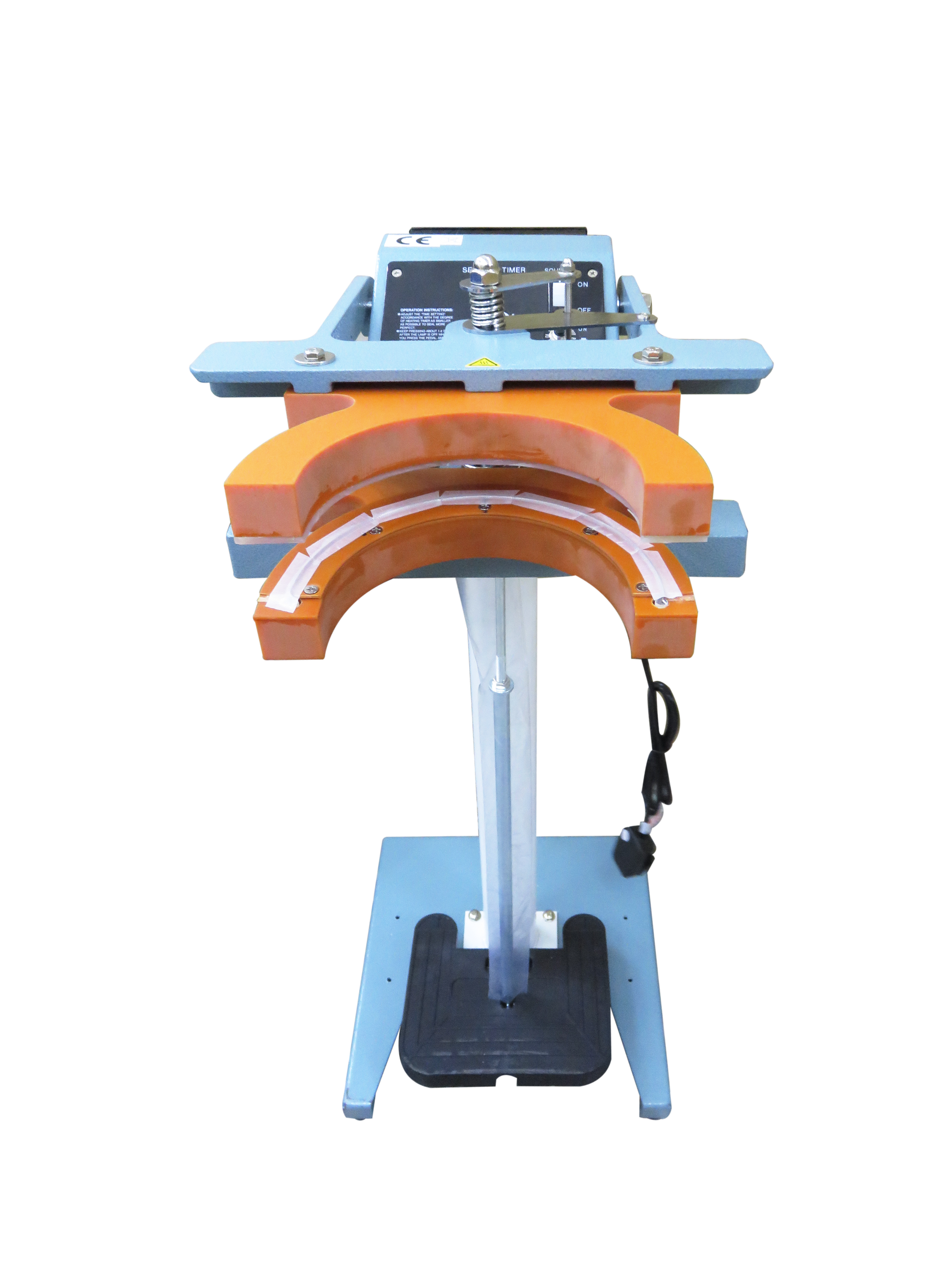圓方圓的足踏式單線瞬熱封口機 W-R系列,為鋁製機體粉體烤漆,電子式時間控制,瞬熱式須3-5秒的壓凝冷卻時間,配備大容量變壓器可供大量使用、設定的封口時間到即不再加熱,安全耐用。、做圓弧形狀封口熔斷,不留邊角,適用於收縮膜,如鍋子、球類、浮板等封口並熔斷,可搭配熱風槍做簡易收縮包裝或收縮膜機進行大量收縮包裝。